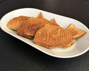 This bag is inspired by the Japanese treat called taiyaki. It’s traditionally filled with red bean paste, but you can stuff it with whatever you like. We happen to have a cast-iron taiyaki mold, so this photo is from when we made some filled with chocolate.